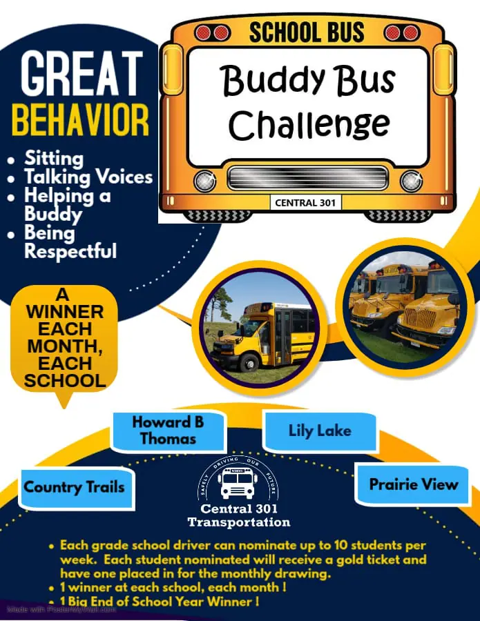 Central 301 Transportation is rolling out a new Bus Buddy Challenge to encourage positive behaviors on the bus! This exciting program rewards students for showing kindness, respect, and responsibility while riding to and from school.