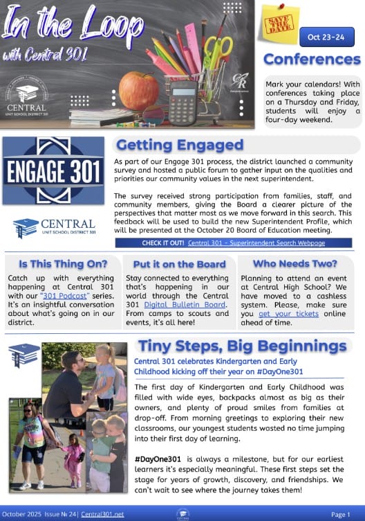 In The Loop serves as the district’s digital newsletter, bringing together highlights, achievements, and important updates from across Central 301 in one accessible format. Designed to celebrate our students and staff while keeping families informed, In The Loop has grown into a trusted resource that reflects the heart and progress of our district.