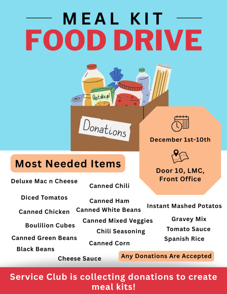Donations can include canned goods, pasta, cereal, hygiene products, and other non perishable items. Service Club has identified several most needed items to help round out the meal kits: