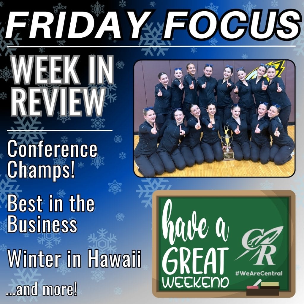 Central High School is hosting the Fox Valley Conference Cheer Championship on Monday. Competition begins at 5:00 p.m., with the Central Rockets performing at 6:45 p.m. We hope to see Rocket Hill full of school spirit.