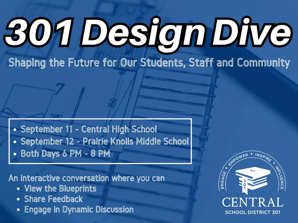 The Central 301 community is invited to participate in an interactive conversation to shape the future for our students, staff and community. This isn’t just about a proposed new high school building, it’s an opportunity to look at blueprints to see the potential layouts for the following: