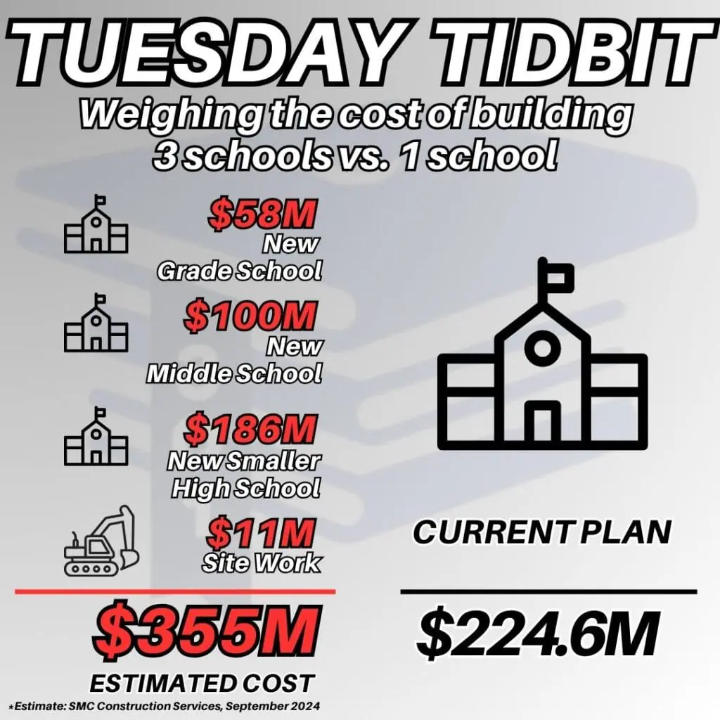 The District has identified building one larger high school as a solution to address the enrollment challenges across all grade levels. While the cost of this solution is significant, the District has determined that it is more cost-effective than constructing a separate elementary school, middle school, and smaller high school to meet the anticipated space needs of our growing student population.