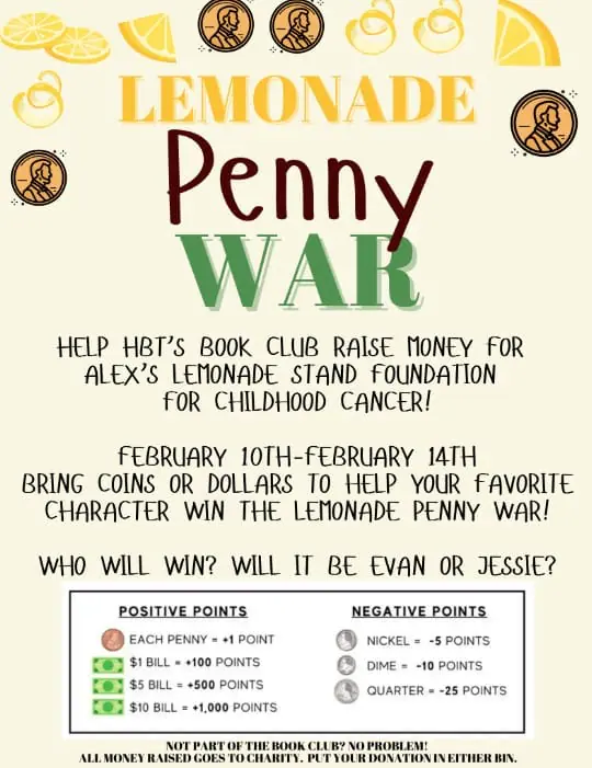The HBT students are participating in a Penny War Challenge in support of Childhood Cancer. All proceeds will be donated to the Alex’s Lemonade Stand Foundation. Please click HERE to view a short video about the fundraiser.
