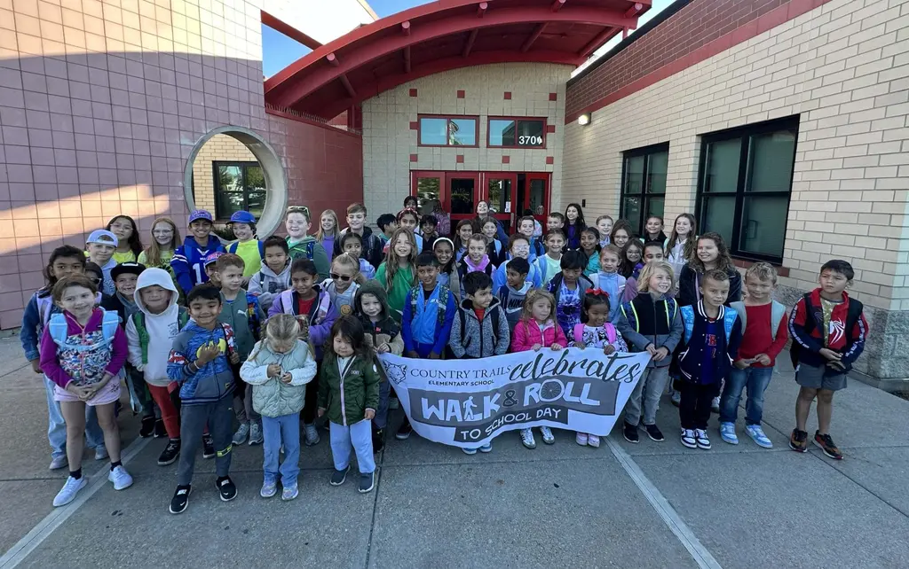 Country Trails students gathered around the neighborhood to participate in National Walk to School Day.