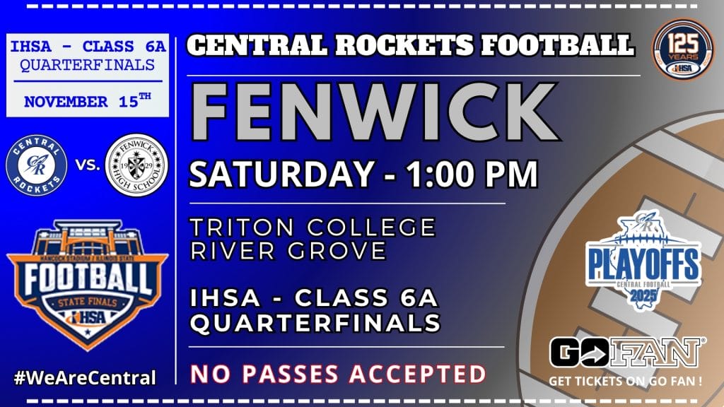 Get ready for another exciting weekend of postseason football! The Central Rockets continue their historic playoff run in the IHSA Class 6A Quarterfinals, taking on Fenwick High School this Saturday afternoon in River Grove.