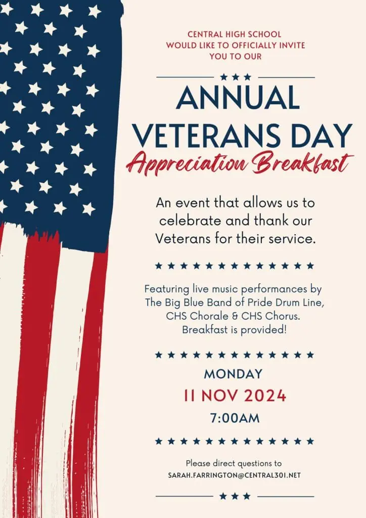 As a thank you to our Veterans, CHS would like to invite them for our annual breakfast on Monday, November 11th. All 301 schools will be honoring those who served with special events. At Central High School, breakfast will be served at 7am and live performances will be provided by the CHS Chorale/Chorus and Big Blue Band of Pride Drumline. If you are a veteran or have a family member you would like to invite, please reach to Sarah Farrington, Assistant Principal of Buildings/Operations.