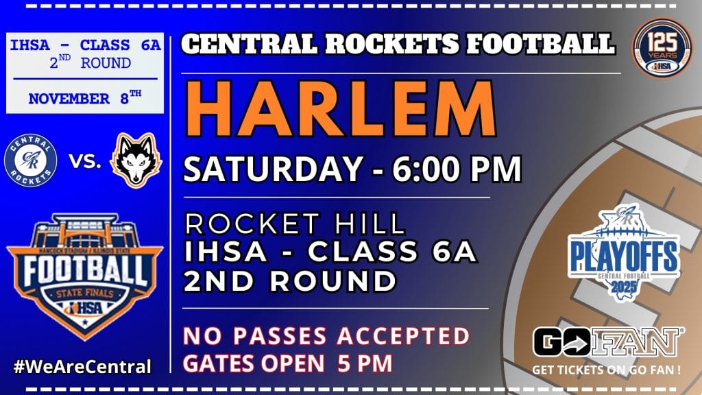 The postseason continues on Rocket Hill as Central High School hosts Harlem in the IHSA Class 6A Second Round on Saturday, November 8, with kickoff at 6:00 p.m. and gates opening at 5:00 p.m.