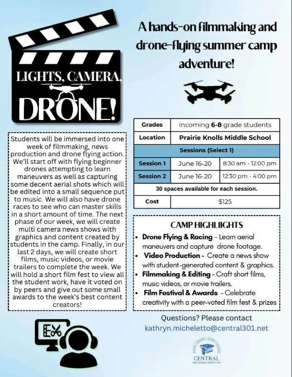 - Video Editing and Drone Camp: In this action-packed camp, students will get hands on experience capturing stunning footage using different devices, including drones. They’ll also learn the ins and outs of video editing and operate mobile studio video equipment used in live broadcasting. It’s a great chance to dive into the world of media production!