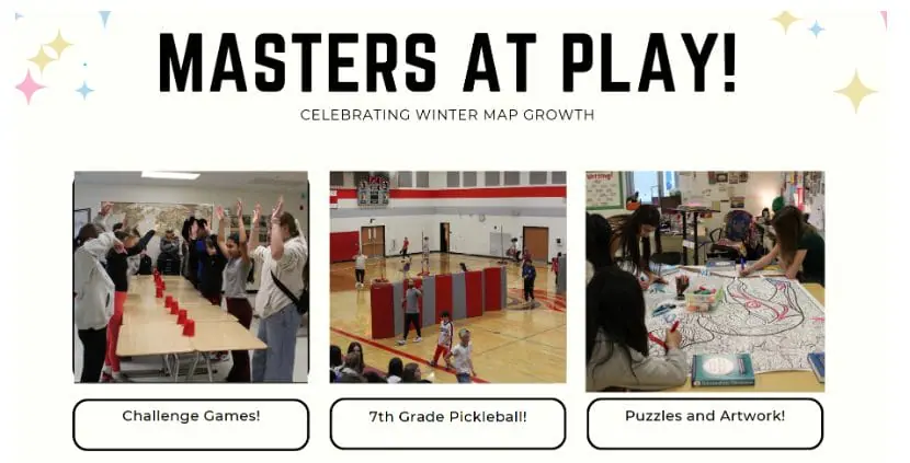 On Thursday, February 26, students had a blast at our “Masters at Play” celebration, recognizing students’ growth on the Winter MAP assessment while building momentum heading into spring testing, including IAR and Spring MAP. We had a great time during our grade level assemblies. 7th Grade held their annual pickleball tournament, while 6th Grade’s Red and Silver teams squared off in a variety of races and games. During classroom rotations, students participated in challenge activities, puzzles, and card games. The best part of the day was the opportunity to unplug, have fun, and strengthen relationships between students and staff. Moments like these remind us that growth happens not only academically, but through connection and community as well.