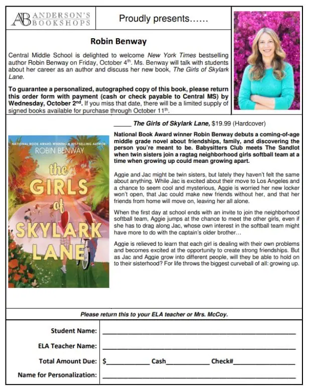 Central Middle School is excited to host an author visit on Friday, October 4th. On this day, Robin Benway will speak to our students about her career as an author and share insights about her latest book. Students and families interested in purchasing a personalized, autographed copy of The Girls of Skylark Lane can complete the attached order form.