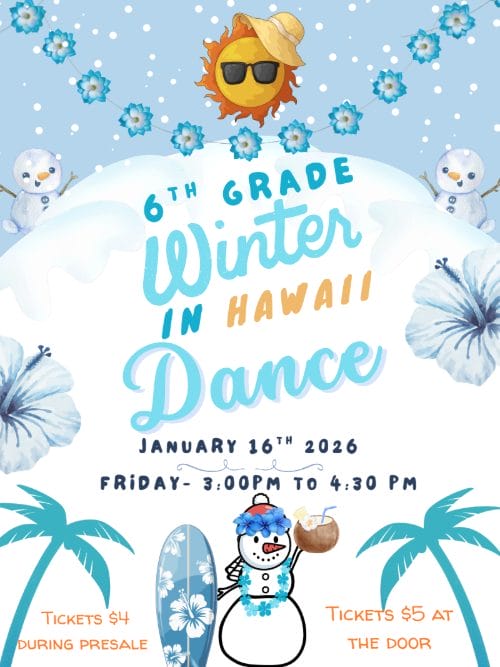 On Friday, January 16th, Prairie Knolls Student Council will be hosting the 6th Grade “Winter in Hawaii Dance”. The dance will begin after school and take place from 3:00 PM – 4:30 PM. Ticket Pre-Sale Food Drive Bonus!
