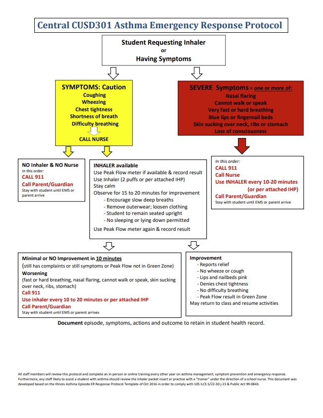 To promote wellness, Central 301 encourages the development of individual health plans for students with significant or chronic health conditions. If your child has asthma, allergies, or seizures, please complete the necessary forms located below. Contact your building nurse to develop an individualized plan for any other concerning conditions. For students with asthma, if an individual care plan is not received, the Central 301 Emergency Asthma Protocol will be followed.